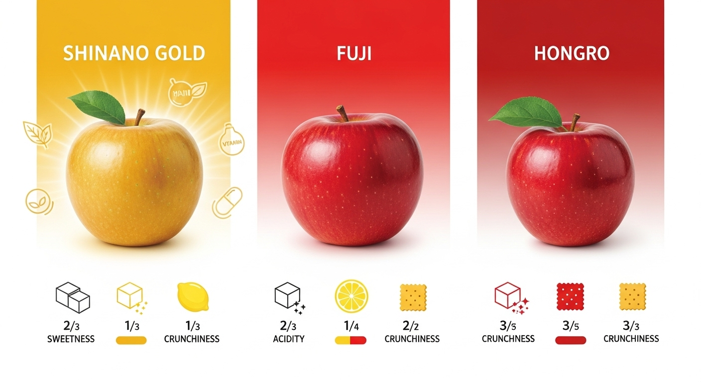 기본적인 영양 성분은 비슷하지만 품종에 따라 특정 성분의 함량에 약간의 차이가 있을 수 있습니다. 시나노 골드는 특히 비타민 C와 폴리페놀 함량이 높은 편으로 알려져 있어 항산화 효과를 더 기대해 볼 수 있습니다.