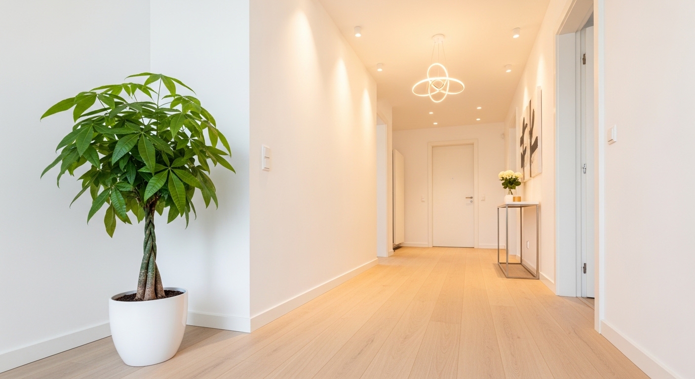**현관의 왼쪽(청룡)**은 재물운을 관장하는 방향입니다. 이곳에 잎이 무성하고 키가 사람 허리 정도 오는 식물을 두면 금전적인 흐름이 원활해진다고 해요. 만약 사업을 하시거나 투자를 하시는 분들이라면 왼쪽에 파키라나 금전수를 배치하는 것을 강력 추천합니다. 단, 통행에 방해가 될 정도로 큰 화분은 오히려 기의 흐름을 막으니 주의하셔야 해요.