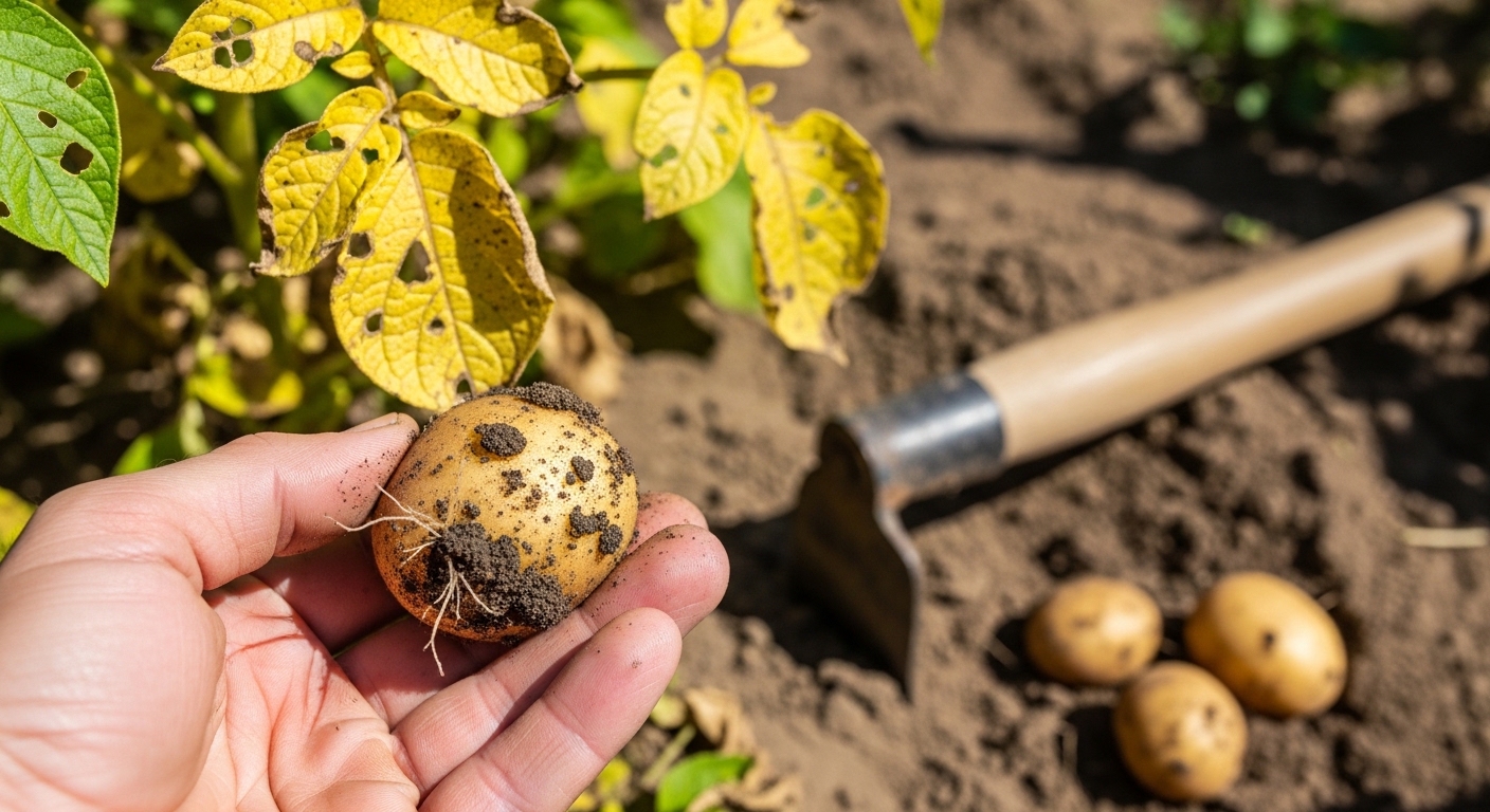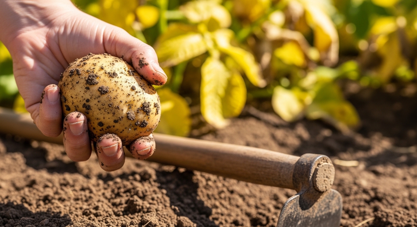 만약 어제까지 비가 왔다면, 오늘 당장 캐는 것은 비추천합니다. 젖은 흙에서 나온 감자는 수분을 잔뜩 머금고 있어서 보관 중에 100% 썩게 되어 있어요. 최소한 하루라도 볕을 쬐어 흙을 말린 뒤 캐야 저장성이 좋아집니다.