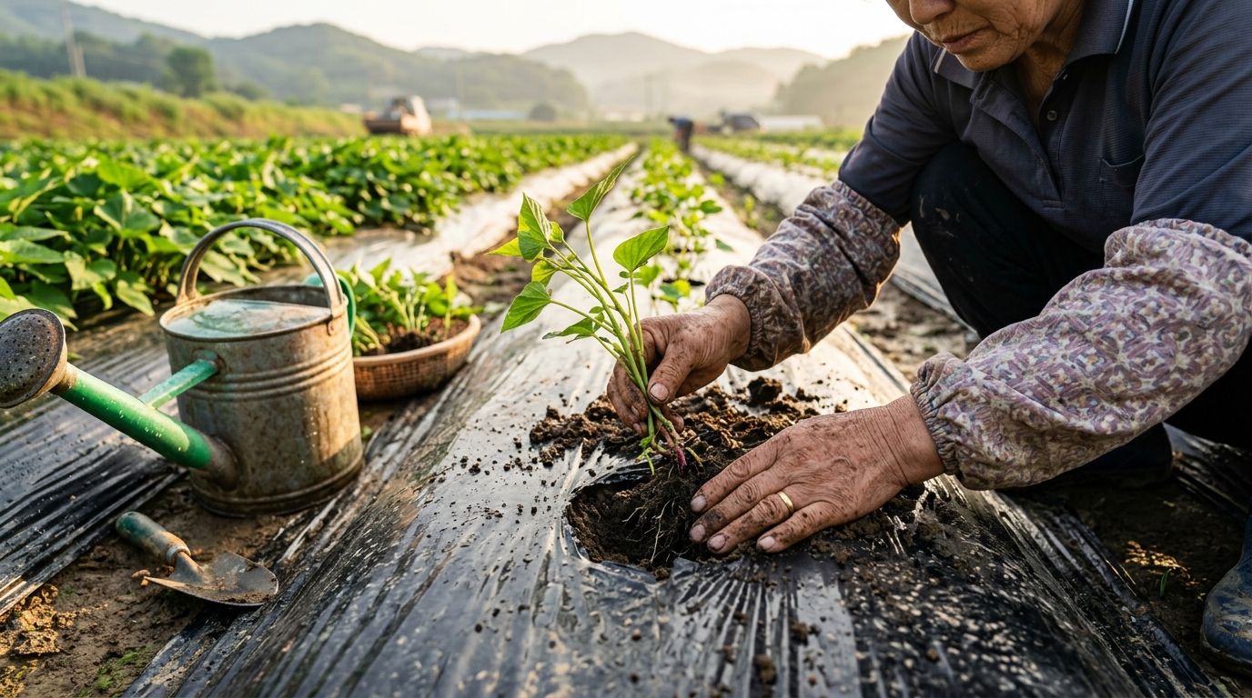 A. 텃밭 규모라면 적극 추천합니다. 잡초 억제는 물론 토양 수분 유지와 지온 상승 효과가 있어 고구마 성장에 결정적인 도움을 줍니다.