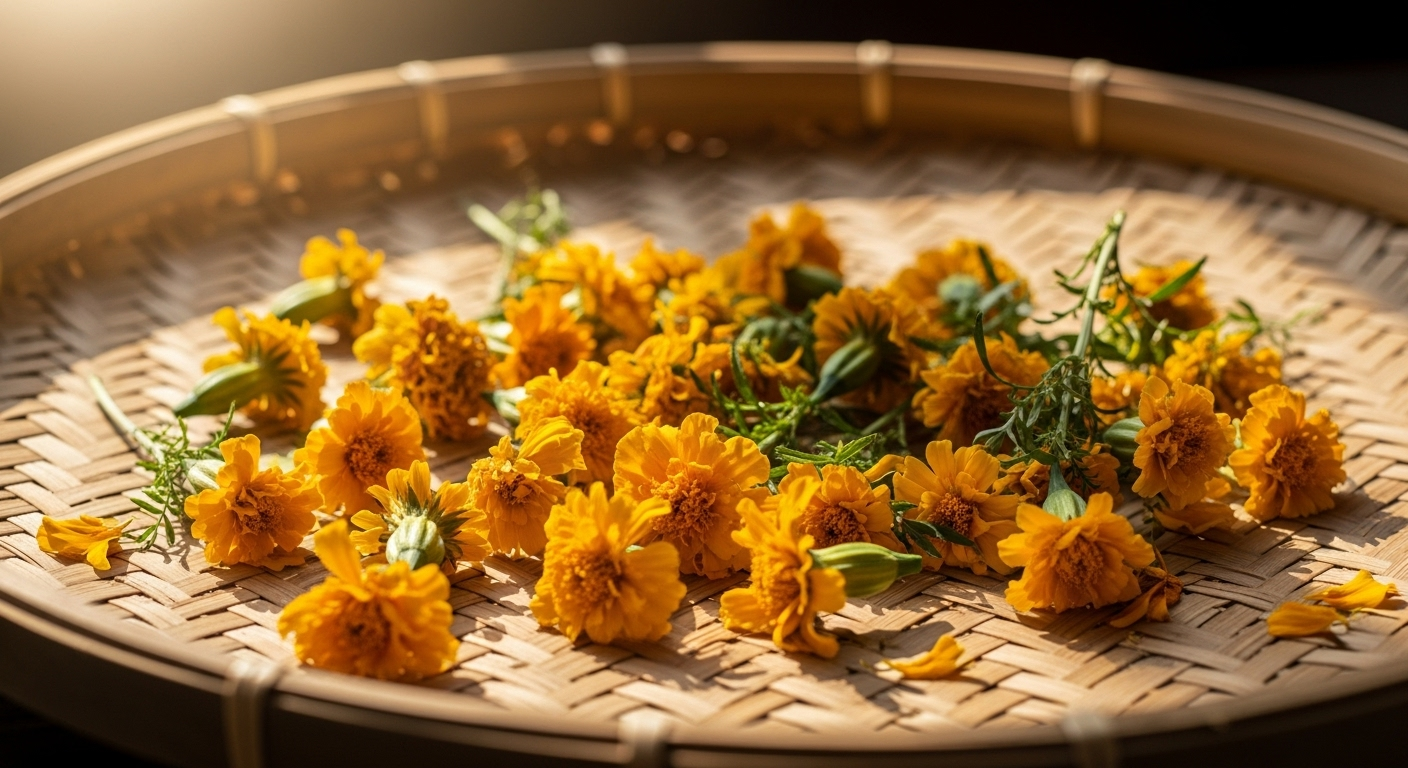 직접 키운 무농약 메리골드 꽃잎을 따서 깨끗이 씻은 후, 바람이 잘 통하는 그늘에서 바싹 말리거나 식품 건조기를 이용해 보세요. 향긋한 꽃차 한 잔이 눈의 피로를 싹 풀어줄 거예요.