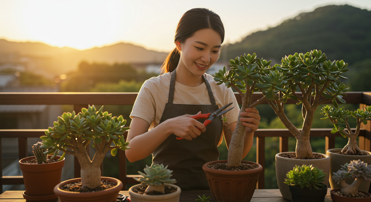 목대형 다육이는 '적심(줄기 자르기)'이나 '순따기(새 순 제거)'를 통해 풍성한 수형을 만들 수 있습니다. 잘린 줄기는 삽목(꺾꽂이)을 통해 새로운 개체로 번식시킬 수 있어 효율적입니다.